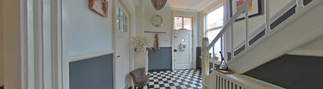 Via de statige voordeur betreed je de indrukwekkende hal waar de authentieke en karakteristieke sfeer voelbaar is. De zwart-wit geblokte tegelvloer, hoge sierplafonds en originele details geven het een warme, klassieke uitstraling. Vanuit de hal is zowel de woonkamer, en-suite eetkamer en de keuken bereikbaar.