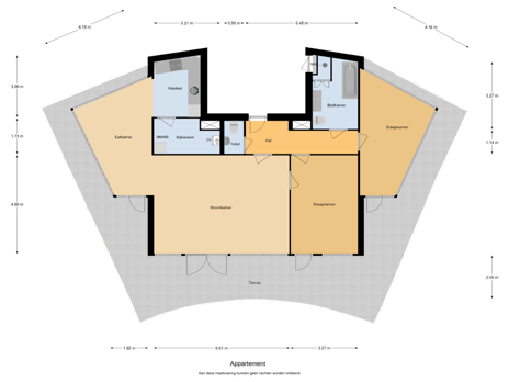 Bij binnenkomst in de entree/hal vind je direct rechts de toiletruimte. Aan deze hal grenzen ook de woonkamer, de twee ruime slaapkamers en de badkamer. De badkamer bestaat uit een ligbad, douche, wastafel en een tweede toilet. Beide slaapkamers zijn ruim bemeten en hebben toegang tot het dakterras.