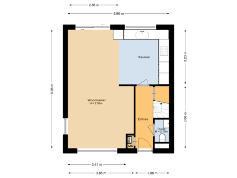 Indeling begane grond: Hal/entree met tegelvloer, trapkast, wandradiator, meterkast, geheel betegelde toiletruimte met wandcloset en wastafelmeubeltje, hardhouten trapopgang naar de eerste verdieping en deur met glasinzet naar de lichte keuken en woonkamer.