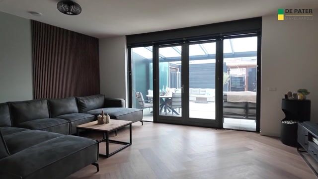 Woonkamer met aanbouw aan de achterzijde, voorzien van openslaande deuren naar de achtertuin. Aan de achterzijde bevindt zich een aluminium veranda met glazen schuifpui.