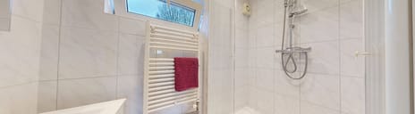 Eerste verdieping: overloop, ruime ouderslaapkamer met een vaste kastenwand, tweede slaapkamer met inbouwkast en de aansluiting voor de wasapparatuur, derde slaapkamer met inbouwkast, badkamer met een douche, vaste wastafel en handdoekenradiator.