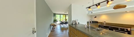 Via de stijlvolle, lichte entree met zicht op de vide betreedt u de royale hal die toegang geeft tot de leefruimte, bijkeuken, toilet en het trappenhuis. De begane grond wordt gekenmerkt door een indrukwekkende rechte woonkamer en halfopen keuken, voorzien van grote raampartijen en aluminium schuifpuien naar de tuin. De zitkamer en het eetgedeelte sluiten naadloos aan op de halfopen keuken, uitgevoerd in warm eikenhout met een betonnen werkblad. Centraal in de keuken staat het kook schiereiland, volledig voorzien van moderne inbouwapparatuur.