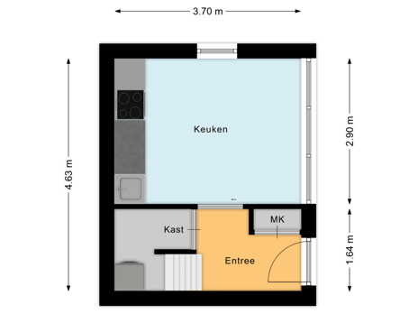 Entree met de meterkast en de trapkast/berging met aansluiting voor de wasmachine. De woonkeuken heeft een grote raampartij, inclusief een extra zijraam, waardoor u de hele dag door kunt genieten van natuurlijk licht. De moderne keuken is praktisch ingericht en biedt alles wat je nodig hebt.