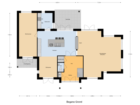 Begane grond: Entree. Hal met garderobe, toilet en meterkast. Woonkeuken (Siematic) met kook- en spoeleiland, alle inbouwapparatuur en openslaande deuren naar veranda. Eetkamer met openslaande tuindeuren. Woonkamer met openslaande tuindeuren. Werk-/Studeerkamer met openslaande deuren naar overkapping. Bijkeuken.