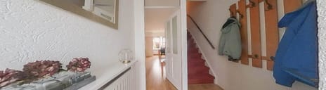 Het autovrije pad brengt je naar de voordeur van deze mooie, uitgebouwde woning. In de hal zijn de trapopgang, de meterkast en de vernieuwde toiletruimte met fonteintje. Qua kleuren is er gekozen voor neutraal wit en sfeervol beige.