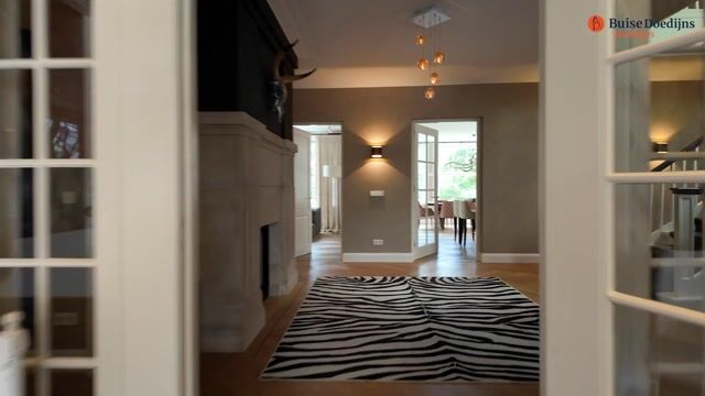 De imposante entree leidt naar een bijzonder royale hal met open haard en doorkijk naar de garderobekamer, stijlvolle gasten-wc. De spectaculaire leefkeuken is het hart van het huis, een ruimte waar design en functionaliteit samenkomen. Voorzien van topapparatuur, een open haard en een royaal eetgedeelte.