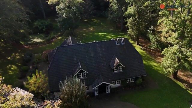 Ground floor: Entrance with vestibule, very spacious reception hall (currently used as a dining room) with fireplace and stylish stairs to the first floor, separate cloakroom with Guest toilet. To the right of the hall is a study with fireplace and French doors opening to the garden. From the living room, there is a beautiful view of the garden through the three sets of double French doors. The spacious, cozy kitchen also includes space for a TV corner. Another set of French doors opens to a terrace. The kitchen leads to the utility room, which provides access to a large cellar with ample storage space.