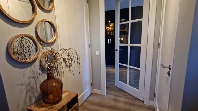 U komt binnen in een ruime hal met modern toilet, meterkast en trapopgang. De woonkamer is licht en sfeervol dankzij de grote raampartijen en de strakke, hoogwaardige afwerking. De luxe doorkijk-gashaard vormt een warm en stijlvol middelpunt en kan zowel vanuit de woonkamer als vanuit de eetkamer worden beleefd.