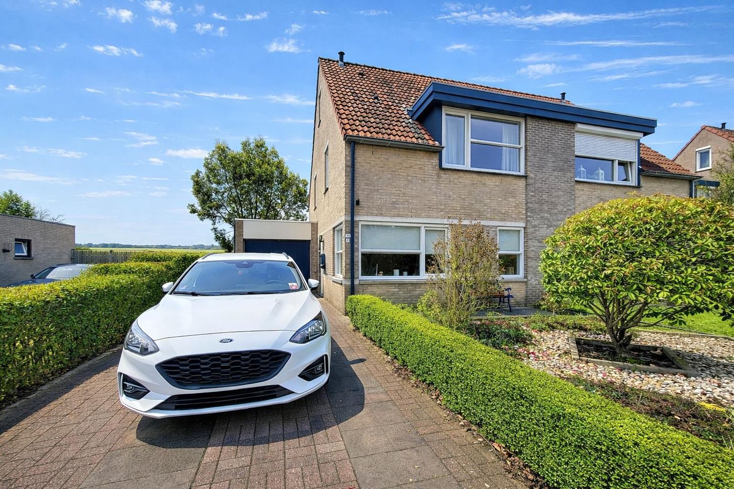 Parkeer tot twee auto’s op de lange oprit aan de voorzijde. De voortuin en oprit zijn fraai aangelegd en de achtertuin is langs de zijkant toegankelijk. Deze circa 15 meter diepe en 10 meter brede achtertuin heeft een ligging op het Oosten en een ver uitzicht over de Zeeuwse polder. Met de 2 terrassen kan je altijd wel ergens genieten van de zon en de natuur.