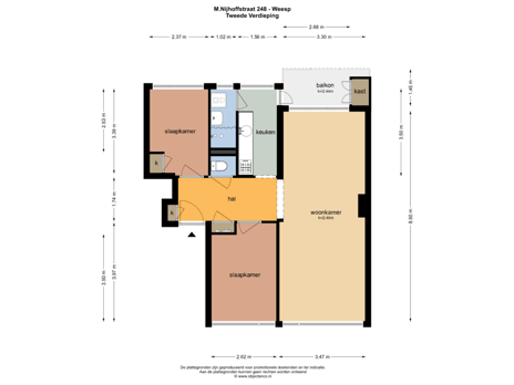Located on the second floor of M. Nijhoffstraat, this bright two-bedroom apartment of 67 m² includes a private storage room in the basement. The apartment features a neat kitchen, a bathroom, a separate toilet, and two bedrooms. The living room spans the full length of the apartment and has windows on both sides, creating a light and pleasant atmosphere. The apartment is fully equipped with double glazing and has an energy label D. Lastly, there is a northeast-facing balcony accessible from the kitchen.