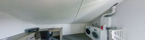Via een vaste trap bereik je de zolder. De grotendeels open zolder biedt voldoende ruimte om extra kamers te realiseren. Achter de knieschotten is diverse bergruimte gecreëerd en zijn de c.v.-installatie en de wasmachine- en drogeraansluitingen te vinden. Voor het nodige daglicht is er een raam in de zijgevel en de vloer is voorzien van mooi tapijt.