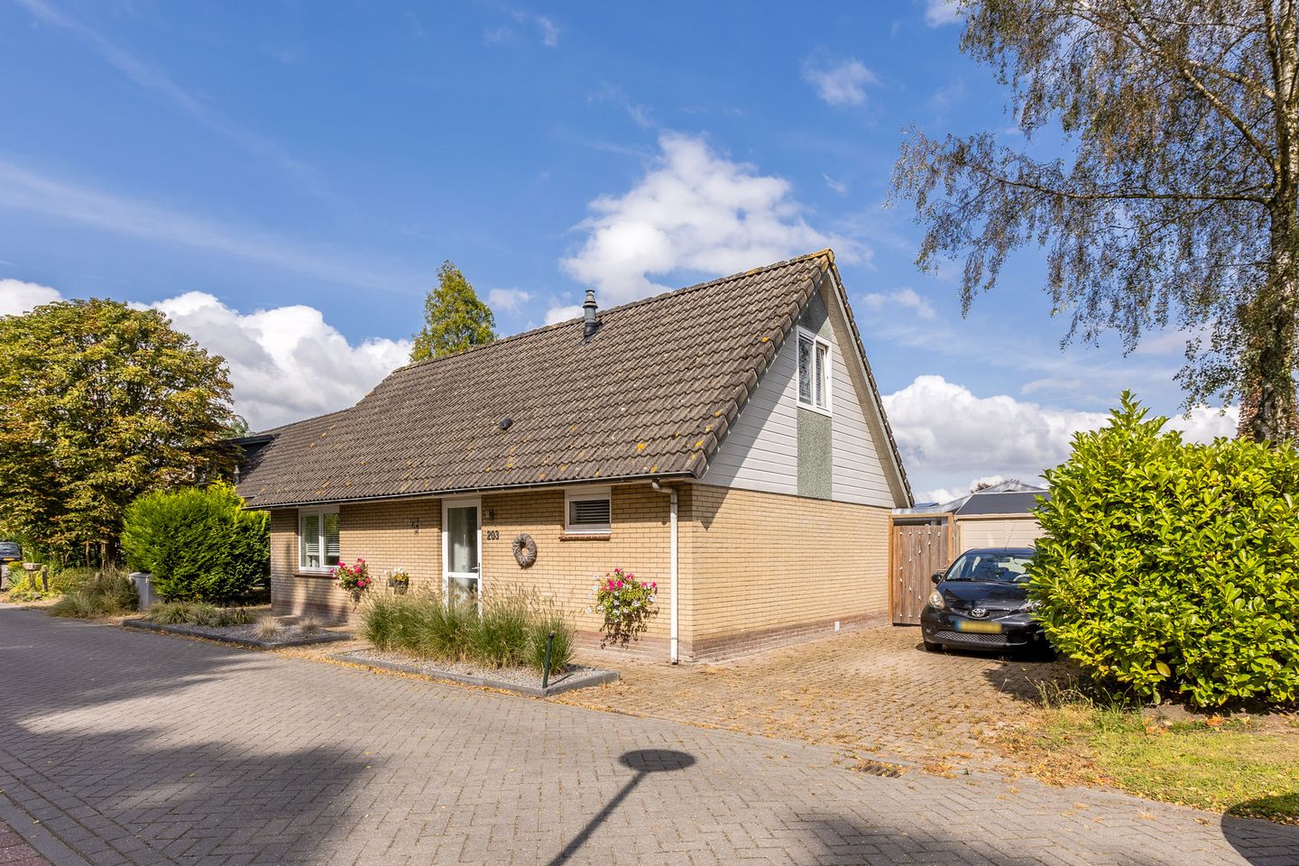 • Oprit met bestrating, ruimte voor meerdere auto's en middels poort (2019) toegang tot de zonnige achtertuin.