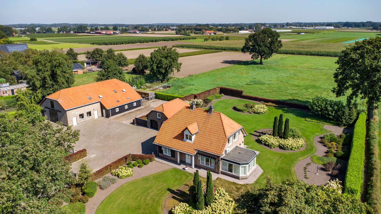 De tuin rondom de woning is werkelijk een parel. Met liefde aangelegd en tot in detail verzorgd. Weelderige borders, kleurrijke hortensia’s en volwassen bomen vormen samen een prachtig geheel dat elk seizoen een ander gezicht laat zien. De verschillende terrassen bieden altijd een fijn plekje in de zon of schaduw; zo grenst één terras direct aan de woonkamer en nodigt het overdekte terras uit tot lange, sfeervolle zomeravonden met uitzicht over de uitgestrekte landerijen. De automatische beregeningsinstallatie zorgt dat het groen er het hele jaar door verzorgd bij ligt.