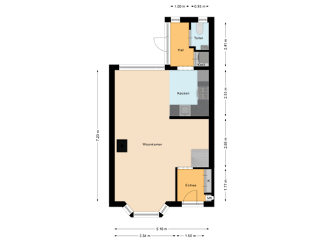 Entrance hall with staircase and modern meter cupboard. Bright living room with bay window and wood-burning stove, open kitchen fitted with built-in appliances (gas hob, extractor, dishwasher, fridge/freezer, oven). Utility room with laundry space and separate toilet.