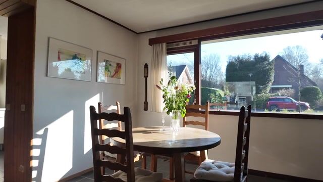 De eetkamer bevindt zich aan de voorzijde van de woning, naast de halfopen keuken. Deze ruimte leent zich, na verbouwing, uitstekend voor het realiseren van een uitgebreide woonkeuken. De ideeën hiervoor zijn reeds door een interieurontwerpster uitgewerkt en zijn in de woning te bezichtigen.