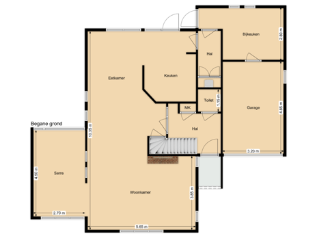 Begane grond: Hal/entree, meterkast, toilet, trapkast, woonkamer, serre, keuken, achterhal, bijkeuken, garage;