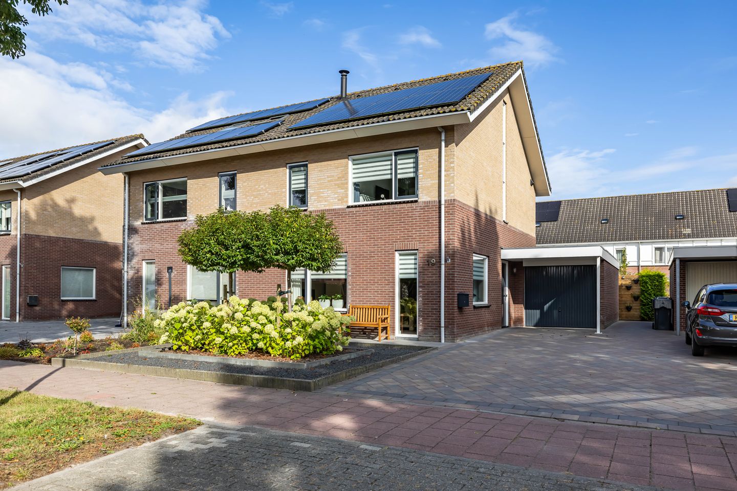 Een royale en luxe afgewerkte twee onder één kap woning met een aangebouwde stenen garage en een achterom naar de achtertuin.