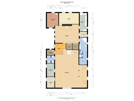 Zuidzijde, met de klok mee: ruime hal, woonkamer (met 2 voormalige bedsteden), slaapkamer, werkkamer, keuken, stookhok/meterkast, zeer luxe badkamer; noordzijde: zeer grote salon, ca 100 m2 met massief eiken vloer, via een serre toegang tot de hobbykas (die thans met aanbouw dient voor verwarming van het geheel middels pellet korrels) bergruimte, strijk/slaapkamer, gastentoilet met afgezonderd witgoedaansluitingen. Trappenhuis met twee forse gedisselde eikenhouten trappen, met afgesloten zijwanden voerend naar de verdieping.