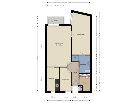 Bij binnenkomst in de woning kom je in de hal. Vanuit de hal zijn de interne berging, de badkamer, de 1e slaapkamer en de woonkamer bereikbaar. De interne berging is ruim van formaat en hier vind je ook de CV ketel en mechanische ventilatie box. De badkamer is voorzien van een toilet, wastafel en inloopdouche. Tevens vind je hier de aansluiting voor de wasmachine en toegang tot de tweede slaapkamer. De eerste slaapkamer is circa 6 m2. Aangekomen in de woonkamer heb je toegang tot de half open keuken. Deze keuken is basic afgewerkt. De ruime woonkamer geeft tevens toegang tot de tweede slaapkamer en het balkon. Vanuit deze slaapkamer van circa 16 m2 heb je toegang tot de badkamer.