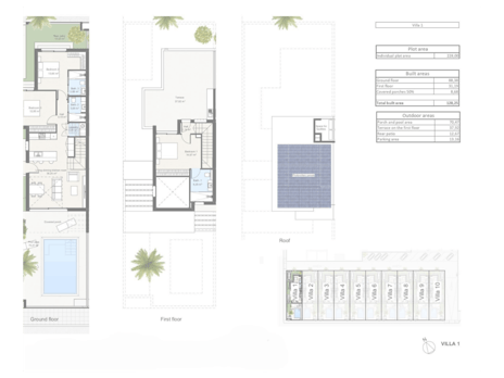 This luxurious complex consists of 10 semi-detached villas. Each property offers a private swimming pool, a garden, a terrace, and a spacious rooftop terrace with a summer kitchen—perfect for enjoying the sun all year round.