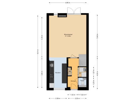 - 45 m² (9.00 metre deep and 5.00 metre wide)
