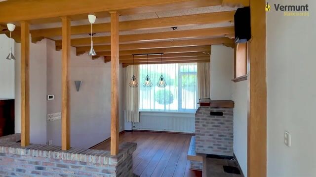 De woonkamer is speels en sfeervol, met een unieke indeling die diverse zithoeken mogelijk maakt. Aan de voorzijde van de woning vind je een gezellige zitkuil met een houten vloer, een kunststof kozijn en een open haard met houten schouwmantel en bakstenen accenten. Dit gedeelte heeft een knus karakter, versterkt door de houten balken aan het plafond en een rolluik aan de voorzijde. Een raam in de linkerzijgevel zorgt voor extra lichtinval. Aan de achterzijde biedt de woonkamer een prachtig zicht op de diepe achtertuin via een groot raam, en de leistenen vloer loopt naadloos door naar de keuken.