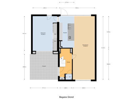 Vanuit de keuken is de bijkeuken/garage bereikbaar, voorzien van extra bergruimte, wasmachine- en drogeraansluiting en toegang tot de tuin. Deze ruimte is voorzien van een elektrische garagedeur.