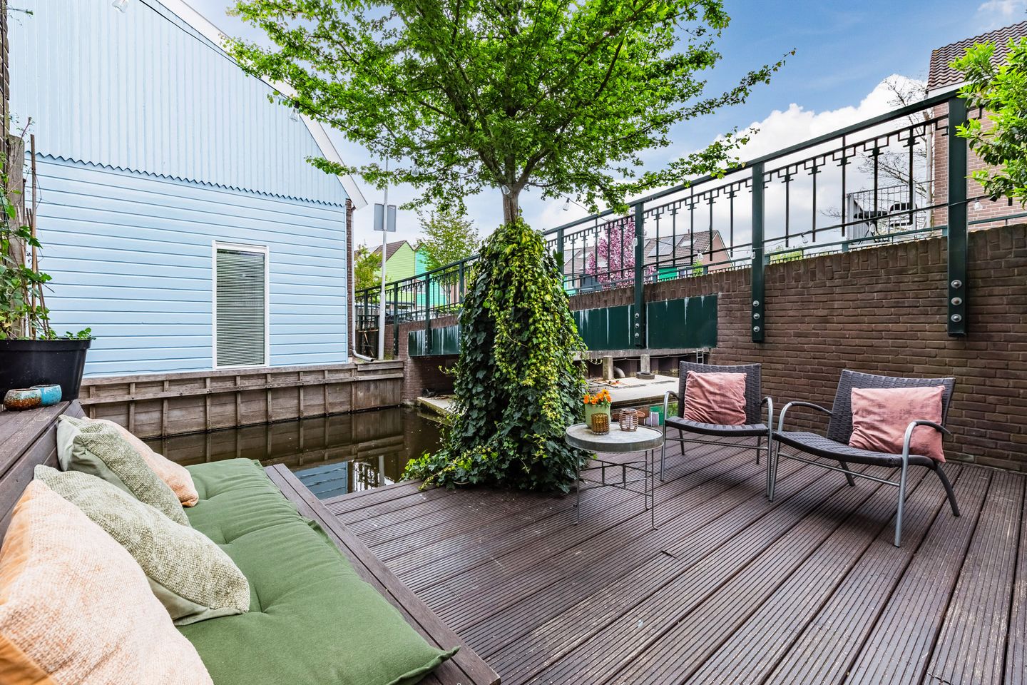 In the living room there are two inward swinging doors to a balcony located above the water. In addition to the balcony, the house has a sheltered side garden. Here you can create a nice lounge area. The same goes for the partly green garden. The garden has a wooden deck overlooking the water. You can relax here too. In the garden is a wooden deck realized overlooking the water. Also here you can relax. All day long you can enjoy the sun on both the deck and in the garden. Are you a lover of boating? Then you have the opportunity to moor a boat here at your own jetty. In the garden is a wooden deck realized overlooking the water. Also here you can relax. The whole day you can enjoy the sun on both the deck and in the garden.