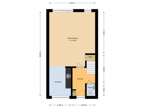 Entree: hal, trapopgang, toilet, toegang tot de woonkamer, keuken en toegang tot de achtertuin.