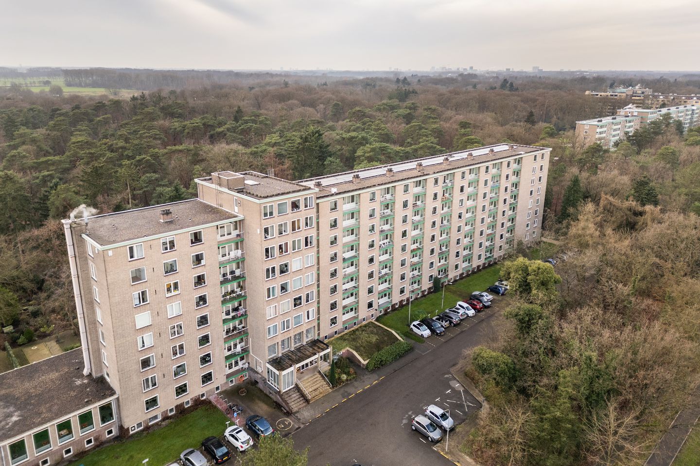 With a beautiful view, it is wonderful to live on the seventh and top floor of the apartment complex "De Oldenborgh". This well-maintained and very neatly inhabited 3-room apartment is, if it is your taste, ready to move into and offers you a beautiful view over greenery on the edge of and overlooking the "Molenbosch". The building is a cooperative association, you buy the right of residence of this apartment, which means that it is not possible to establish a mortgage. There is also a minimum age of 50 years and at the start of the membership you must not be older than 75 years. "De Oldenborch" is a beautiful and characteristic building that was built in the late 50s in the woods of Zeist. The location is an ideal mix of peace and bustle. For those who are not (yet) familiar with the area: Shops for daily groceries are nearby, as is the center of Zeist with many cozy restaurants, shops and theater and cinema "Figi". Slot Zeist is also nearby.