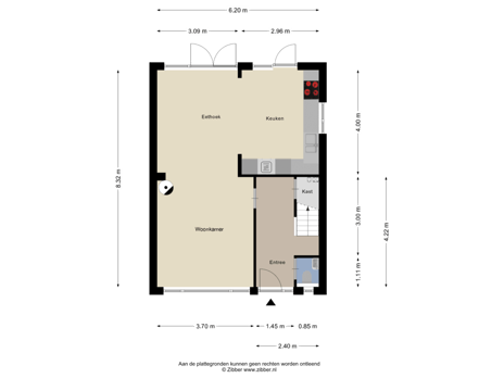 Begane grond: Entree, hal met trapopgang naar de 1e verdieping, wandtoilet met fontein, trap/meterkast, woonkamer met openslaande tuindeuren, open keuken met toegang naar de tuin.