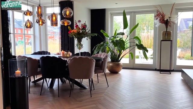 De tuingerichte woonkamer is bijzonder licht dankzij maar liefst drie dubbele deuren naar de achtertuin. De sfeervolle waterdamp-haard met licht- en ledverlichting zorgt voor een warme uitstraling zonder uitstoot.