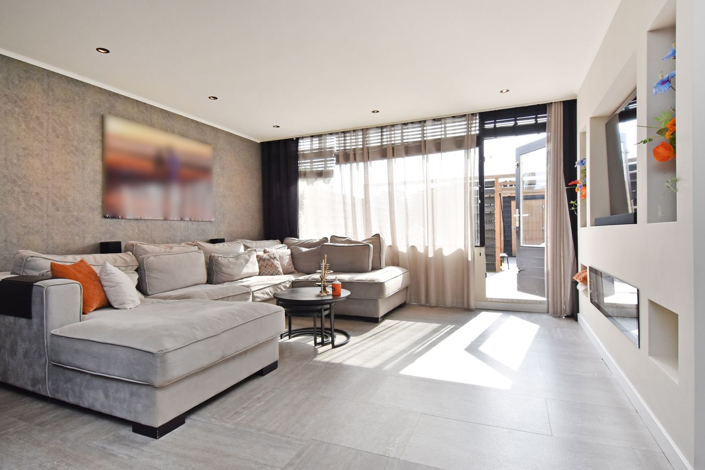Via de stalen schuifdeur kom je in de zeer lichte en royale woonkamer van circa 28m², welke is uitgevoerd met een "Cinewall" en grote raampartijen met deur naar de achtertuin.