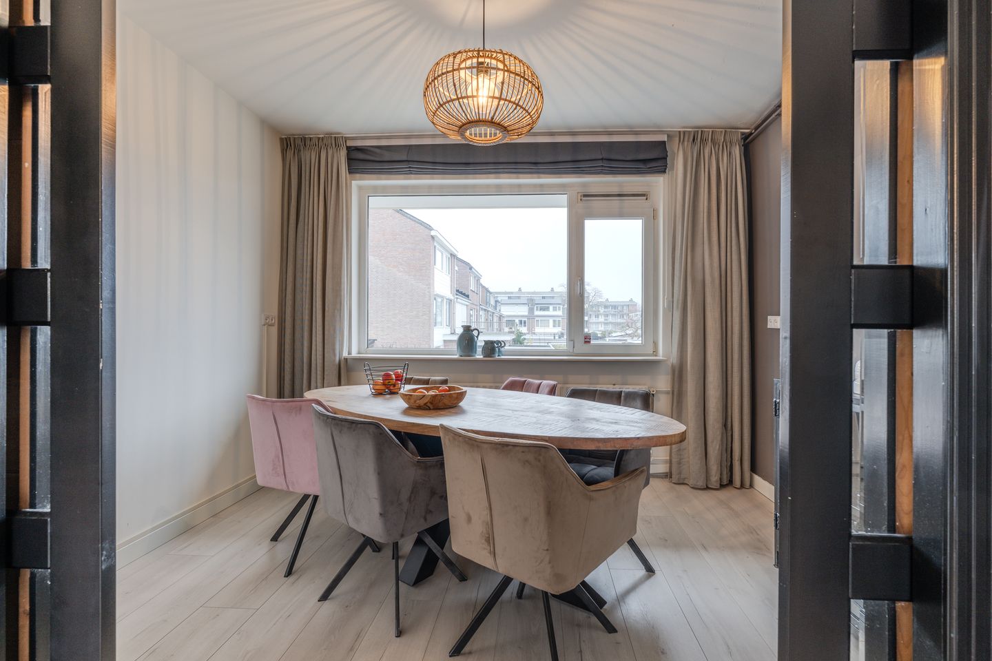 De woonkamer is ruim opgezet en geniet van veel lichtinval dankzij de grote raampartijen. Aan de voorzijde van de woning bevindt zich een prettige, afgescheiden ruimte die uitstekend kan dienen als eetkamer, slaapkamer of werkkamer en staat in verbinding met het woongedeelte door middel van schuifdeuren. Hierdoor ontstaat een fijne combinatie van wonen en dineren met een ruimtelijk gevoel.