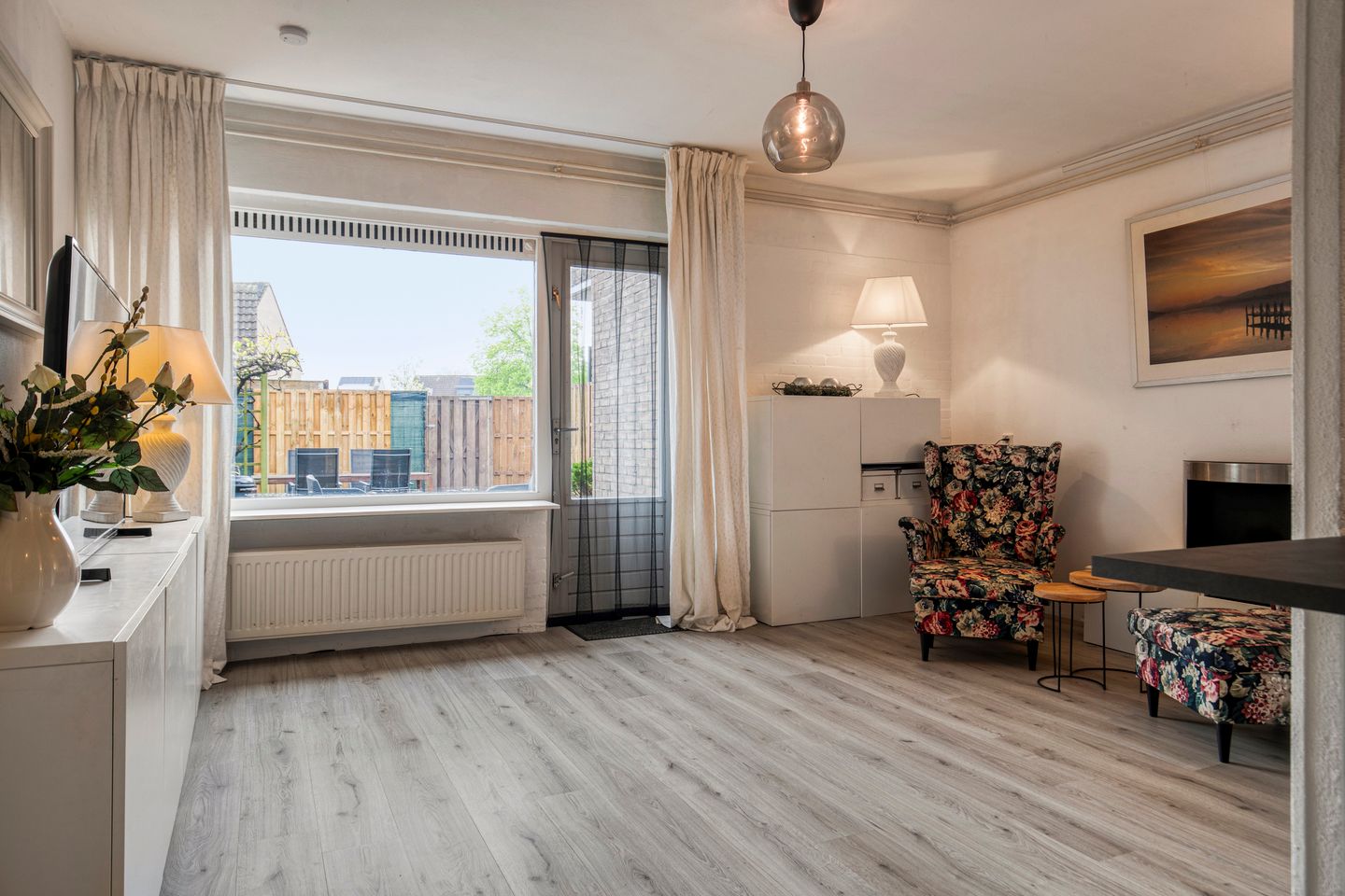 Vanuit de hal loopt u door naar de lichte woonkamer en open keuken. De keuken biedt toegang tot de slaapkamer. De Slaapkamer ligt aan de voorzijde en kijkt uit op de groene voortuin. Het woongedeelte ligt aan de tuinzijde, wat zorgt voor veel natuurlijk licht en een prettig uitzicht op de tuin.