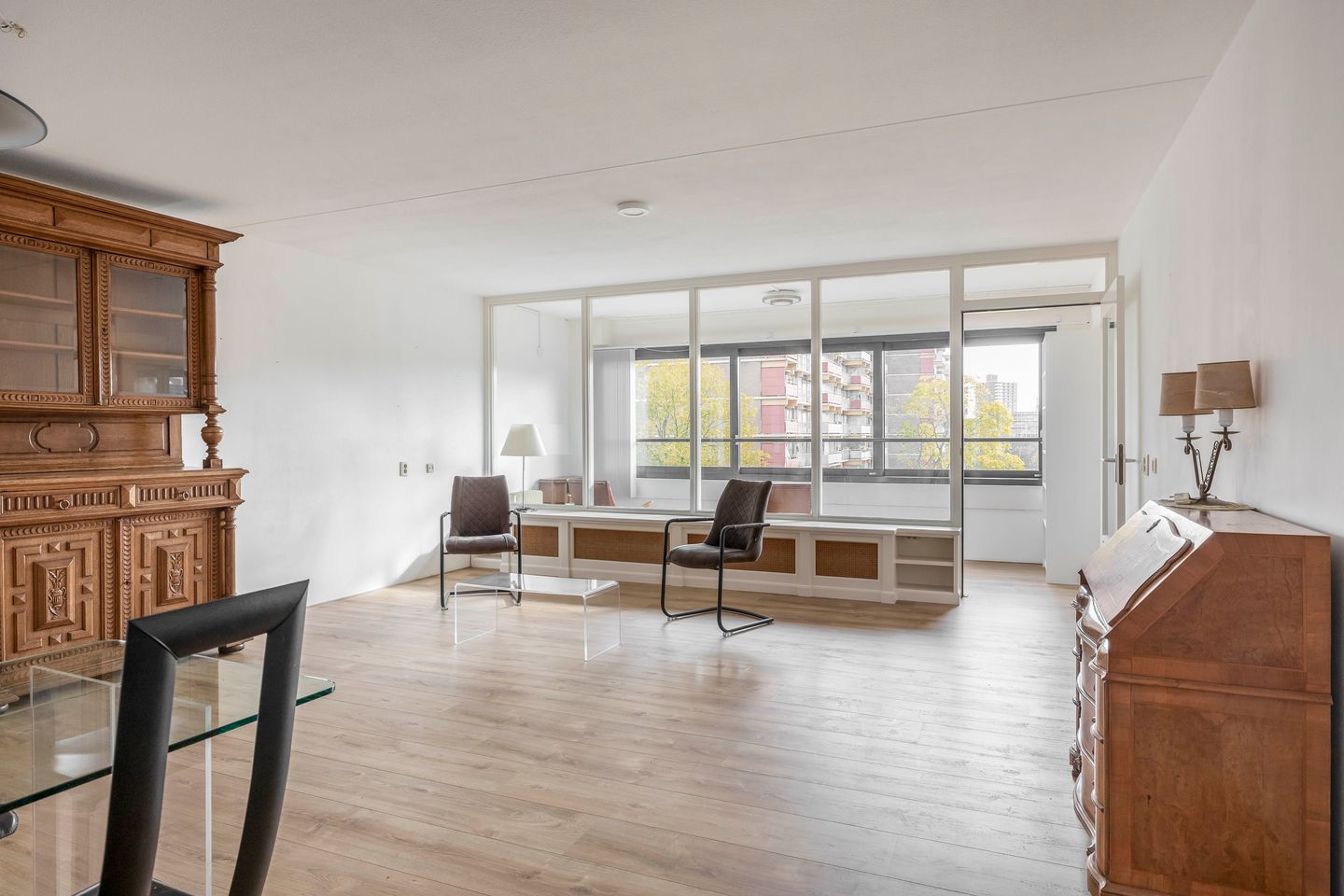 Zodra je binnenkomt, valt de ruime indeling direct op. De woonkamer is royaal opgezet en heeft dankzij de grote raampartijen een fijne lichtinval. De loggia aan de achterzijde, bereikbaar via de woonkamer, is een heerlijk verlengstuk van de leefruimte. Deze is voorzien van grote schuiframen waardoor je ook bij minder weer comfortabel zit, met een prettig vrij uitzicht over de groene omgeving en bebouwing in de verte. De vloer is netjes afgewerkt en de wanden zijn in neutrale kleurstelling gehouden, wat een rustige basis geeft aan de ruimte.