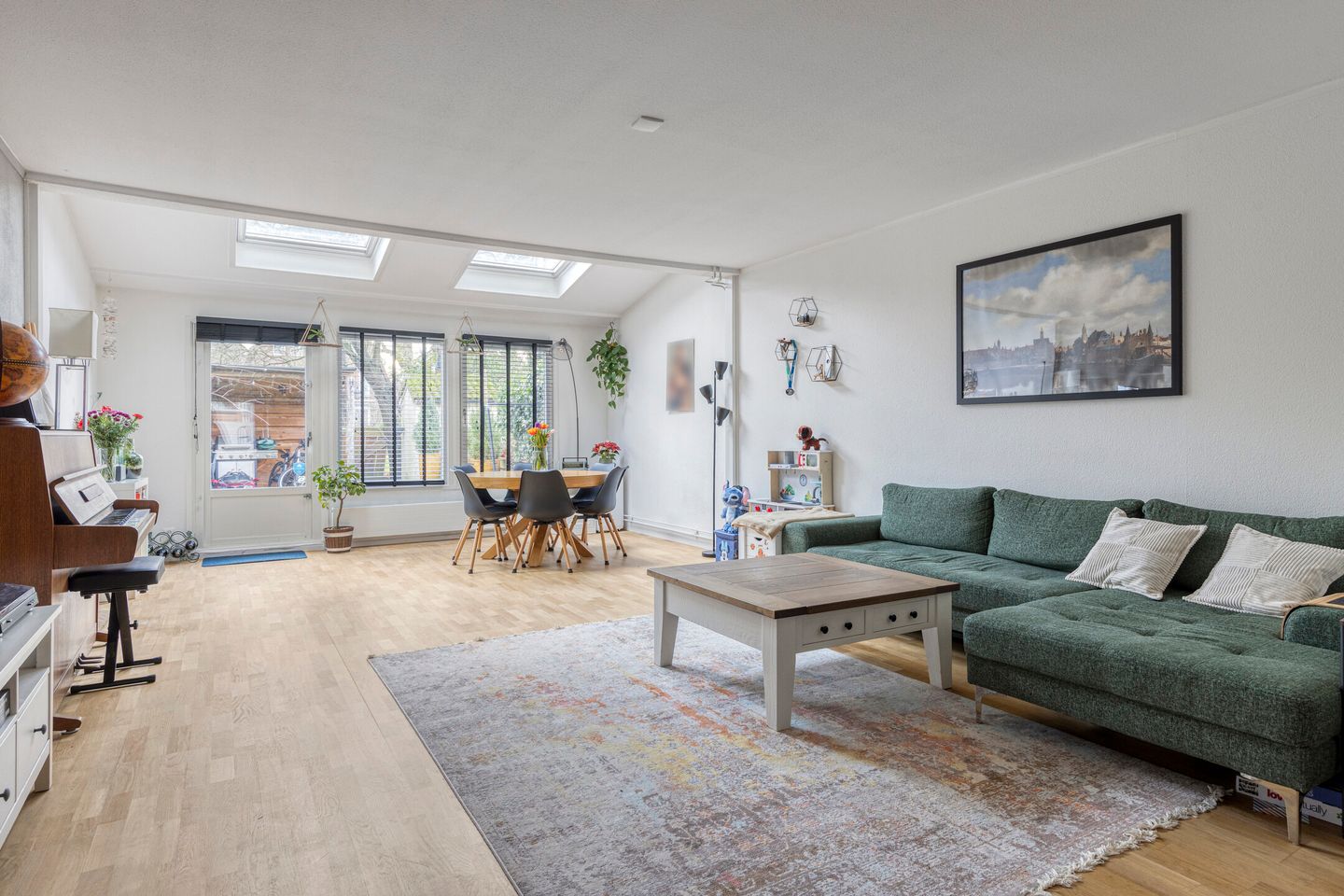 De riante woonkamer bevindt zich aan de achterzijde van de woning en is uitgebouwd met maar liefst 2,5 meter. In deze uitbouw zijn dakramen geplaatst, waardoor een prachtige lichtinval ontstaat en de ruimte nog ruimtelijker aanvoelt. Dankzij de royale maatvoering biedt de woonkamer volop indelingsmogelijkheden; of u nu kiest voor een grote zithoek, een speelhoek of een royale eethoek, het kan hier allemaal.