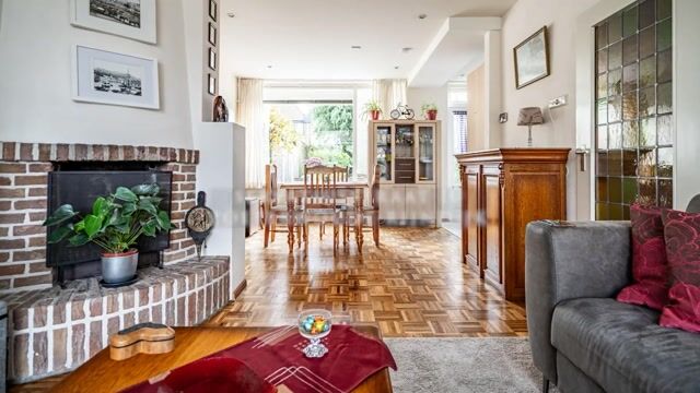 Via de diepe voortuin betreed je de woning en stap je binnen in de lichte woonkamer. De grote ramen aan de voorzijde zorgen voor een prettige lichtinval én een vrij uitzicht op de groene voortuin. De centraal geplaatste open haard vormt een sfeervol middelpunt tussen de zit- en eethoek en geeft de ruimte een warme, huiselijke uitstraling.