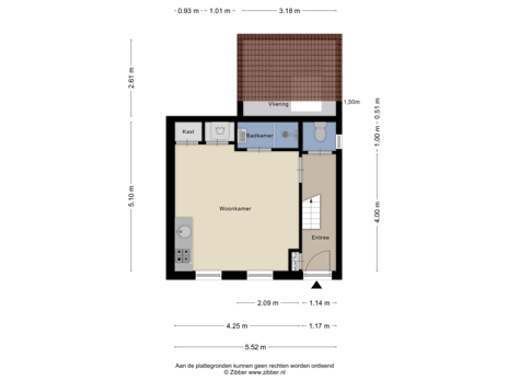 Begane grond: entree, trapopgang, toilet, woonkamer met open keuken, badkamer met douche en wastafel, toilet.