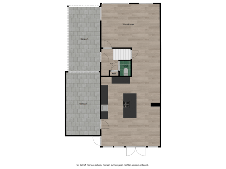 Indeling: entree/hal, toilet, L-vormige woonkamer ca. 30 m² met een fraai uitzicht over het water, met trapkast, woonkeuken ca. 30 m² met kookeiland en openslaande deuren naar de tuin (met overdekt terras). De woonkeuken is voorzien van vloerverwarming. De garage van binnenuit bereikbaar.