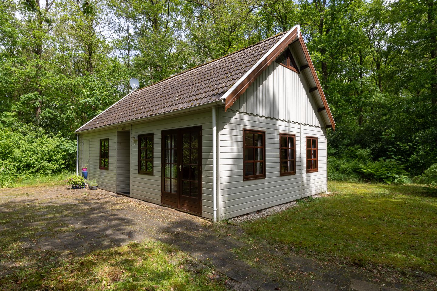 Fraai in de bossen van Zuidlaren gelegen recreatiebungalow gebouwd in 1995. Deze woning is gelegen op het terrein van Recreatievereniging Slootsbergen. Dit is geen commercieel park dus rust en privacy zijn hier gegarandeerd. Uiteraard zijn de eigenaren lid van Recreatievereniging Slootsbergen. Het kleinschalige park is ruim van opzet en elk lid heeft zijn eigen kavel grond van 100m2 (uitgegeven in erfpacht). Op het terrein staat een grote schuur waarin de leden een eigen bergruimte kunnen huren, indien plaats beschikbaar.