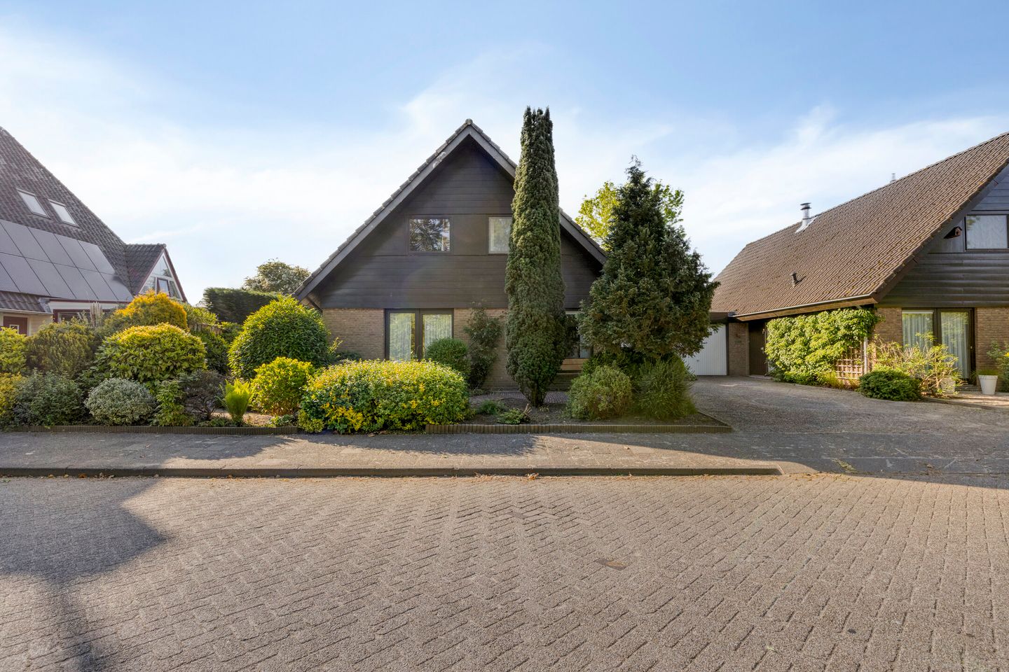 De zonnige achtertuin biedt veel privacy en genoeg ruimte voor een plekje in de zon of schaduw. Het geheel is omgeven door een groene haag en vaste beplanting. Er is een terras, vijver, toegang naar de garage en een achterom. Aan de voorzijde is er parkeergelegenheid en een tuin met vaste planten.