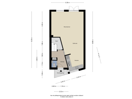 Afmeting woonkamer/keuken circa: 5.36/2.43x4.20/9.30 en 9.96 diepste punt.