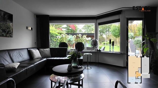 Tuingerichte woonkamer met een natuurstenen zwarte tegelvloer voorzien van vloerverwarming. Vanuit de woonkamer een prachtig vrij uitzicht over de aangelegde achtertuin met de aangrenzende singel, het wandel/fietspad en het plantsoen met veel groen. De woonkamer is voorzien van een diepe trapkast met vaste planken en verlichting.