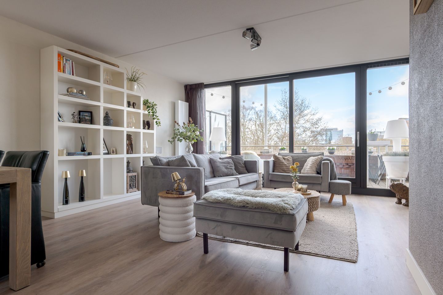 Je komt binnen in een ruime entree met toilet, meterkast en trapopgang. De speelse woonkamer vormt het hart van het appartement en valt direct op door het hoge plafond, de grote ramen en de royale schuifpui naar het terras, waardoor er veel licht binnenvalt. Daarnaast is er een praktische provisie-/cv-kast.