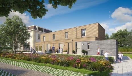 Direct achter het te renoveren klooster, in de voormalige kloostertuin, worden vier stijlvolle starterswoningen gebouwd - twee eindwoningen en twee tussenwoningen - elk met een eigen buitenruimte en separate berging. Deze woningen vormen de perfecte schakel tussen het historische klooster, de parkachtige tuin en de nieuwe woongebouwen in het plan.