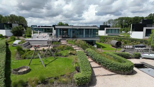 Via de trap en het pad loopt u verder de tuin in. Aan de ene kant is een loungebank met haardvuur en een speelplaats voor de kinderen gerealiseerd. Aan de andere kant is een vrijstaande sauna te vinden en een terras met een buitenkeuken. Grenzend aan het meer is een privéstrand gesitueerd. Aan de voorzijde van de woning, onder het terras, is een carport gerealiseerd. De woning beschikt over meerdere terrassen.
