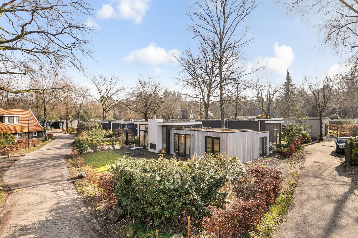 De woning beschikt over parkeergelegenheid voor één auto op eigen terrein. Op het park zijn diverse voorzieningen aanwezig, waaronder een binnen- en buitenzwembad, wellness, horeca en sportfaciliteiten.