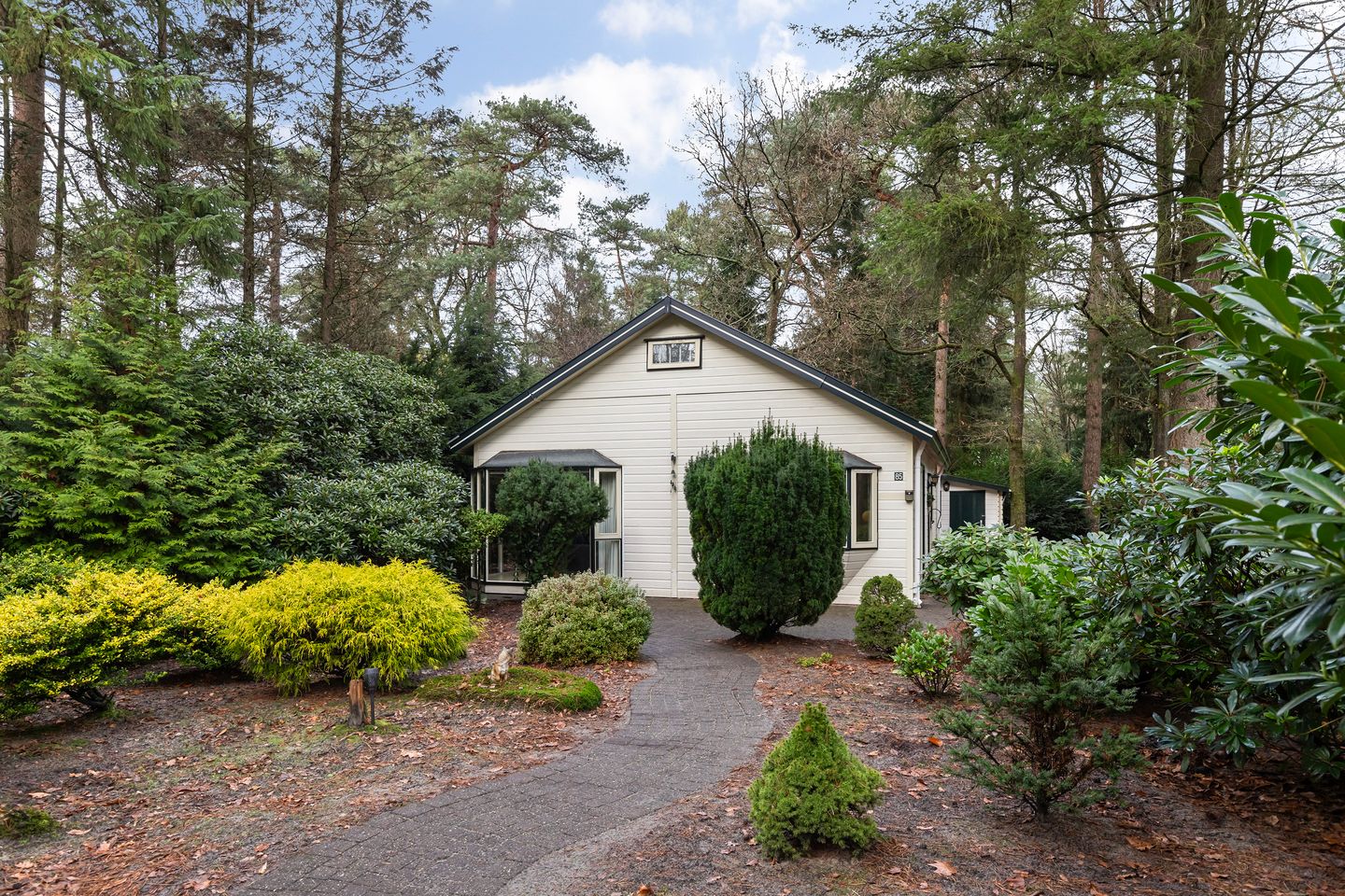 De recreatiewoning is gelegen op een ruim perceel in een groene, bosrijke omgeving. De tuin is natuurlijk ingericht met volwassen bomen, struiken en slingerende paden rondom de woning. Hierdoor sluit de buitenruimte goed aan bij het karakter van de omgeving en biedt deze veel privacy. De tuin vraagt beperkt onderhoud en biedt voldoende ruimte om buiten te zitten en te genieten van de rust en natuur. Een prettige plek voor recreatief verblijf, met het gevoel van vrij wonen midden in het groen.