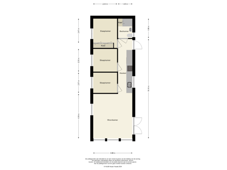 De drie slaapkamers, die naast elkaar liggen, bieden alle voldoende opbergruimte. De badkamer, direct naast de hoofdslaapkamer, is voorzien van een douche, toilet en wastafel.